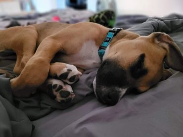 Zoey just celebrated her 7th birthday, but she hasn't slowed down yet! This girl loves nothing more than to run zoomies in the yard and take over ALL the bed at night.